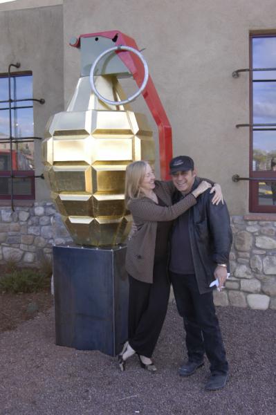 Albuquerque Journal Editor's Notebook December 12, 2004 By Karen Peterson In the early morning sun, that golden oval sculpture outside Linda Durham's gallery on Paseo de Peralta, with its bright red "tag" and green top, gleams like an oversized tree ornament. Actually, it's a six-foot-tall, gold-encrusted grenade. Gallery director Patrick Carpenter says it's an anti-war statement. Artist Martin Cary Horowitz notes that it went up in front of Linda Durham's a week before the November 2 election. "People thought it was perfect timing," Horowitz said. "Stop the war, get rid of what's-his-name." Reaction to the piece varies, however. "It's been bringing people in the door," says Carpenter, many of them wondering whether the gallery "is supporting war or terrorism or something." "They thought (the grenade) was threatening in some way," he said. Others view the grenade in a more positive light, although neither Carpenter nor Horowitz could quite articulate this view. "Thank God there's strength in armaments, and yadda yadda," said Horowitz, who also has applied gold leaf to variously sized bomb casings and real (but disarmed) grenades. Reviewing two new books about Iraq by his fellow war correspondents in the latest New York Review of Books, New York Times reporter Christopher Hedges noted that "combat has an undeniable attraction." One consequence of this, says Hedges, is that war reporting too often delivers "the mythic narrative of war" rather than its "revolting and horrifying" reality. Weaponry beaten into art, if Horowitz's grenade is any indication, may suffer from the same conundrum. "Making death pretty," was how one person in our newsroom described the sculpture this week. Not coincidentally and not altogether unlike the news from Iraq, it's also a saleable commodity. A six-pack of Horowitz's small grenades can be had at Linda Durham for $4,000. The larger ornament outside will set you back $35,000. In an effort to "stimulate conversation," presumably of both art and the war, Carpenter said the gallery held an essay contest on the grenade. The results will be announced shortly - perhaps this week. We'll be interested to hear what Santa Fe has to say on the subject. Copyright © 2004 Albuquerque Journal