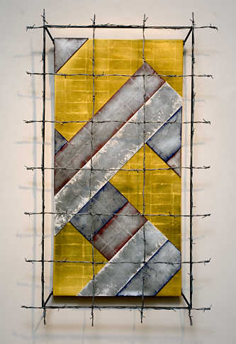 Bronze, barbed wire, enamel, palladium, 23.75 kt gold