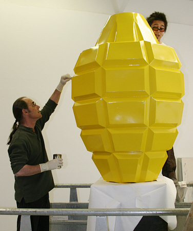 Newly powder coated grenade being prepped for re-gilding